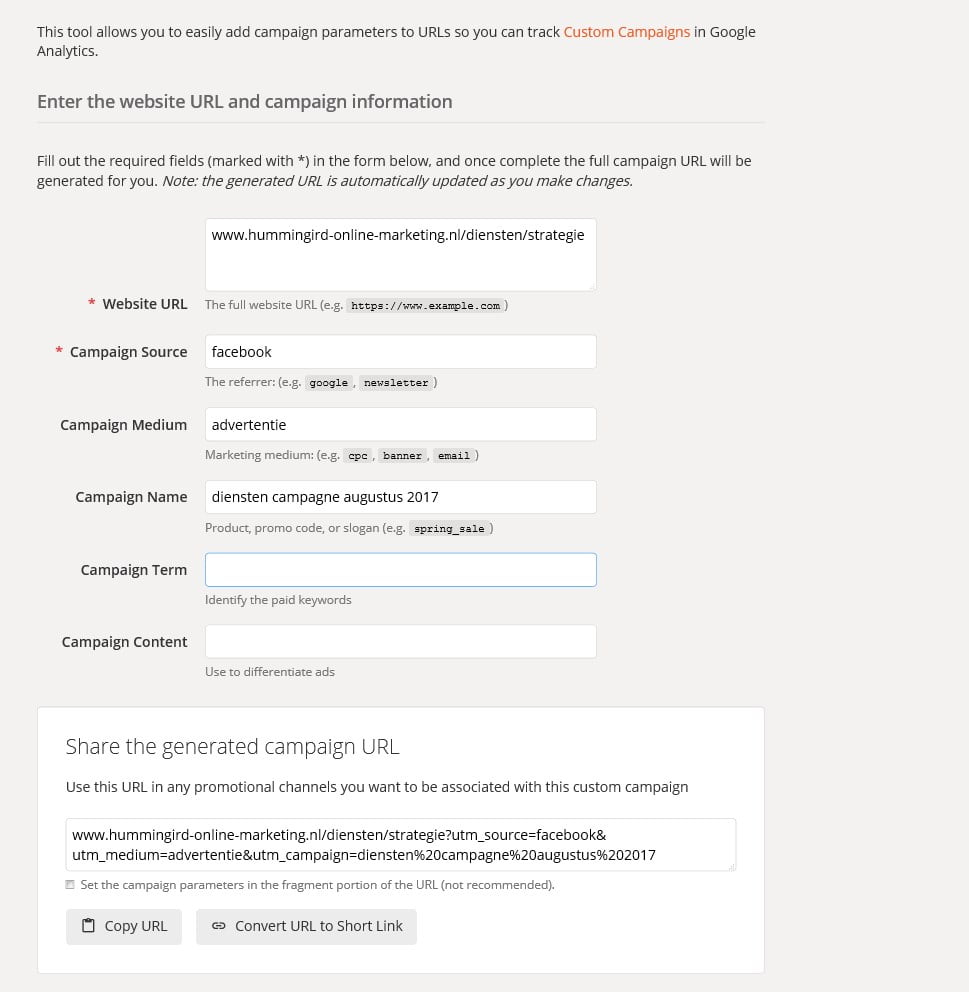 In dit voorbeeld gebruik ik https://ga-dev-tools.appspot.com/campaign-url-builder/ (Google tool), maar je kunt bijvoorbeeld ook Raventools gebruiken.