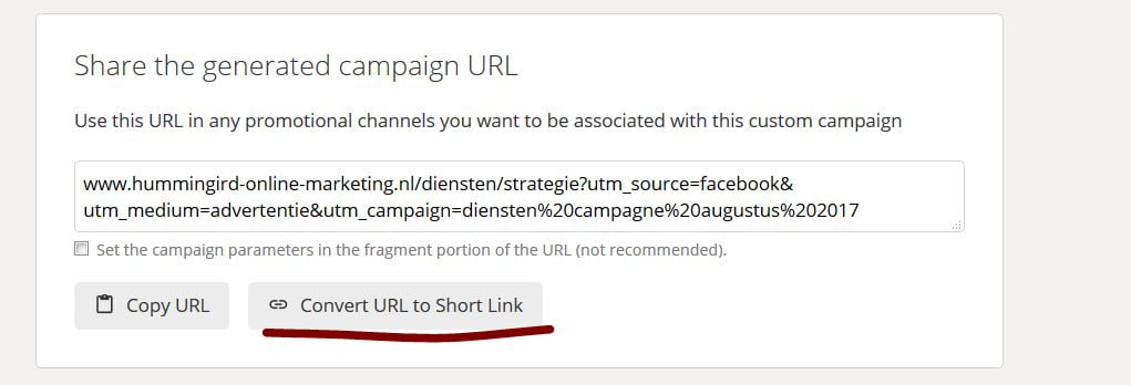 We gaan weer even verder met de tool van Google. Klik op Convert URL to short link en je verkorte URL verschijnt. In deze link is je UTM opgenomen. Wanneer je deze URL weer plakt in een browser verschijnt de lange URL en zie je de UTM staan. Peanuts dus!